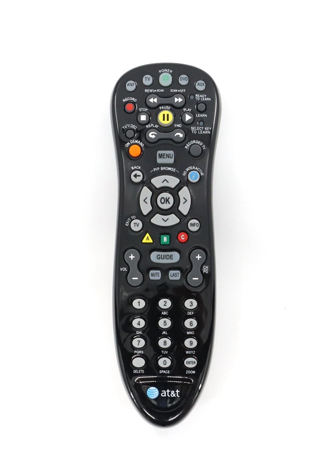 AT&T A20-RF1 3-Device U-Verse RF remote control, designed for use with AT&T receivers and set-top boxes. This remote provides reliable and convenient control for your home entertainment system. Although it supports universal setup capabilities, some functions may not work with devices other than your receiver. Manual setup is required for TVs, DVD players, and other AV equipment. Ideal as a replacement or spare remote for your AT&T system.