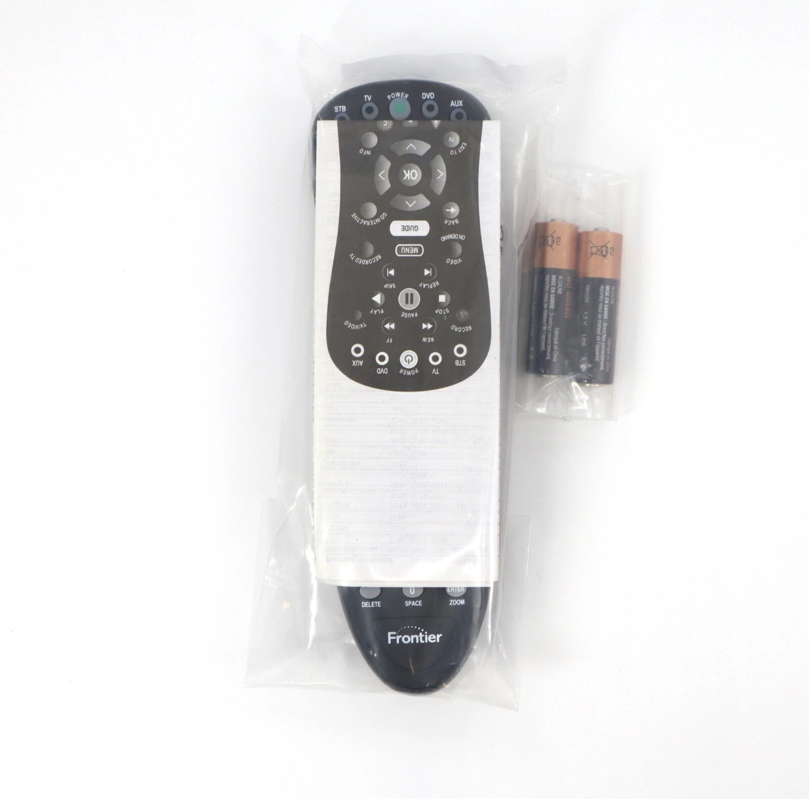 Frontier remote control (model RC1534901/01B) designed for use with compatible Frontier receivers and set-top boxes. This wireless remote features a dedicated Netflix button for quick access to streaming content and includes batteries, ready to use right out of the box.