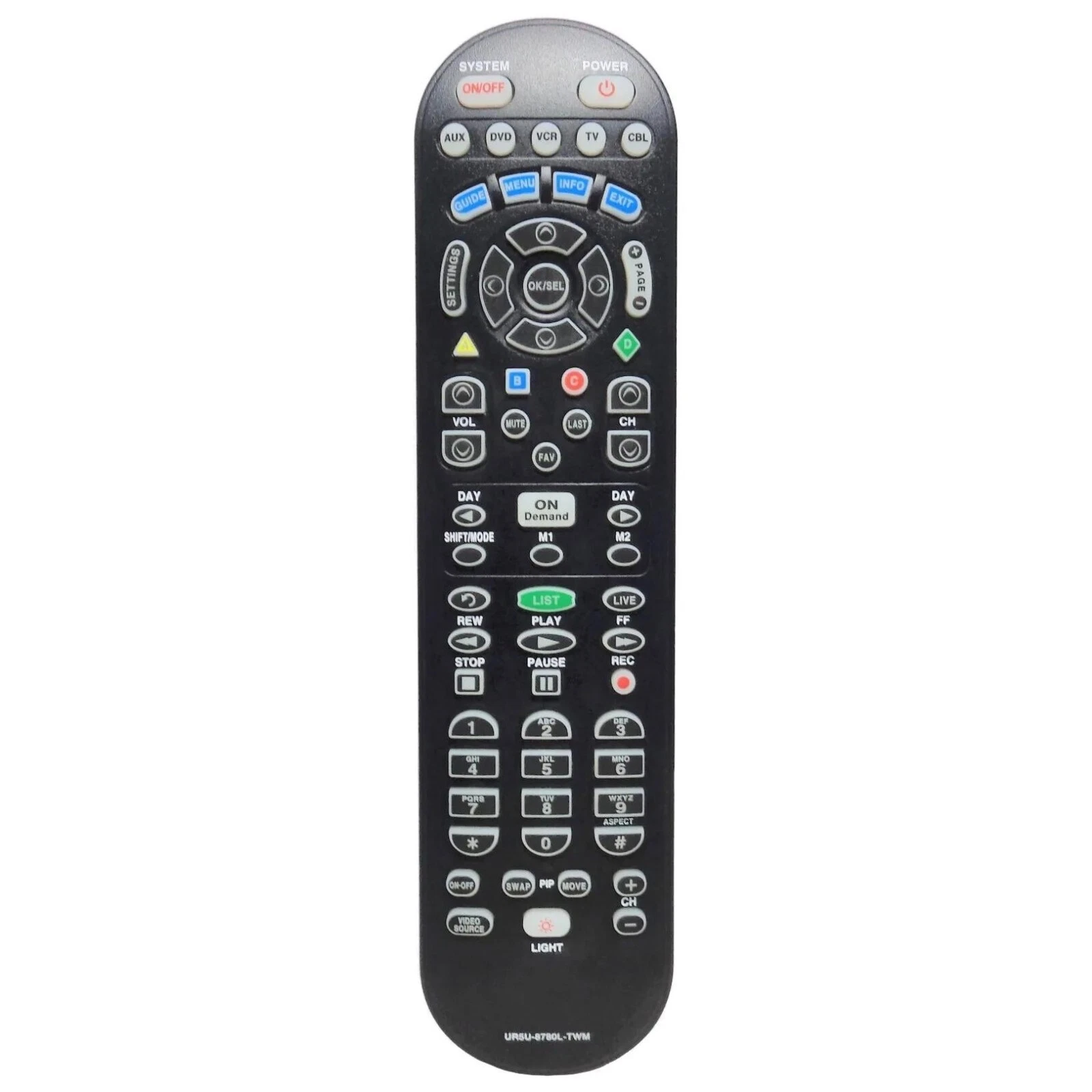 URC UR5U-8780L universal remote control with a large keypad, designed for use with a wide range of cable TV boxes, TVs, DVD players, and AV receivers. This wireless remote offers a reliable 5–10 meter range, making it ideal as a replacement or spare remote for your home entertainment system.