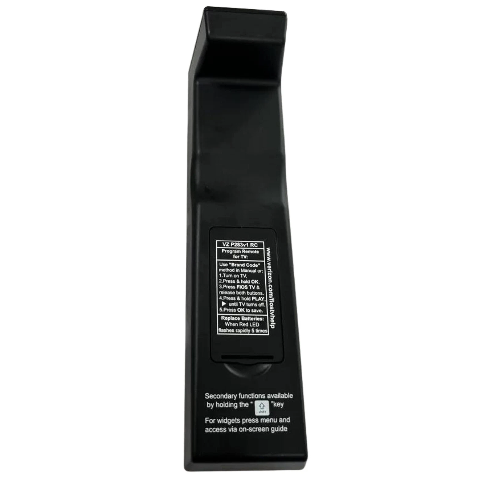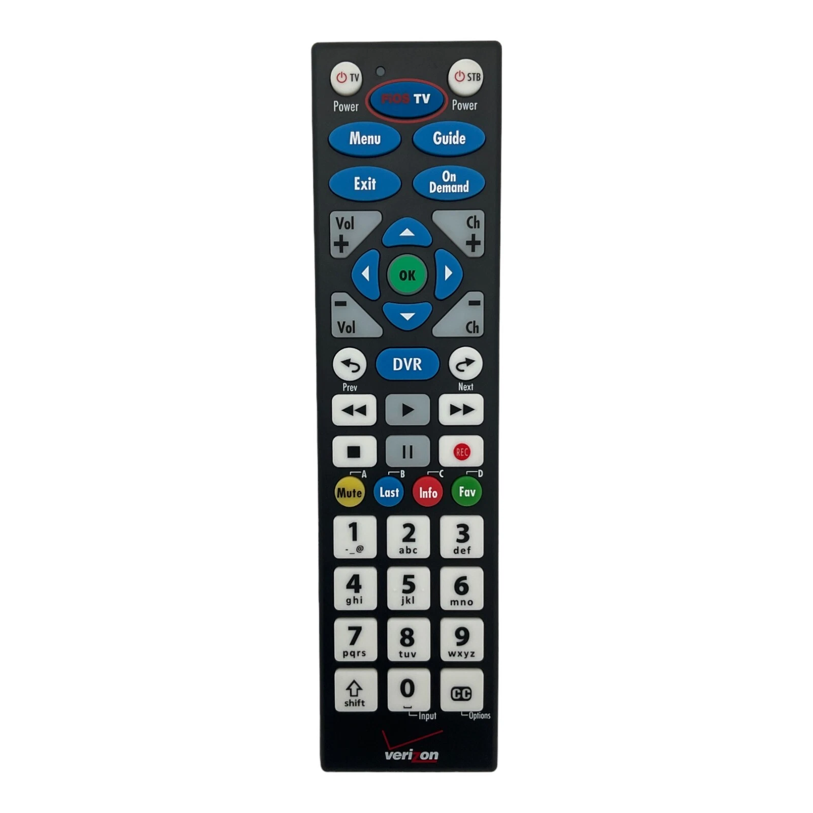 Verizon Fios big button universal TV remote control, model VZ P283V1 RC, designed for easy and convenient use with Verizon Fios TVs and compatible set-top boxes. This wireless remote offers a 5–10 meter operating range and features large, easy-to-read buttons for simplified control. Although it supports universal setup capabilities, some functions may not work with devices other than your receiver. Manual setup is required for TVs, DVD players, and other AV equipment. Ideal as a replacement or spare remote for your home entertainment system.