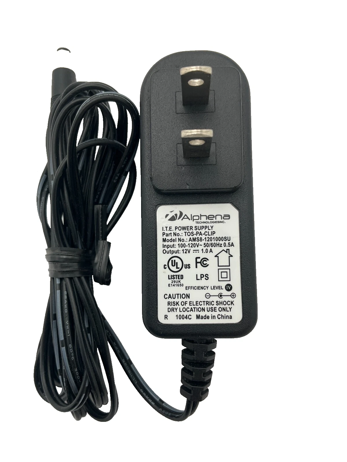 Alphena ITE adapter, model AMS8-1201000SU (P/N: TOS-PA-CLIP). This adapter supports an input of 100-120V 0.5A 50/60Hz and provides a 12V 1A DC output, making it a suitable replacement power supply for compatible electronic devices. Please verify voltage, current, and connector compatibility before purchase.