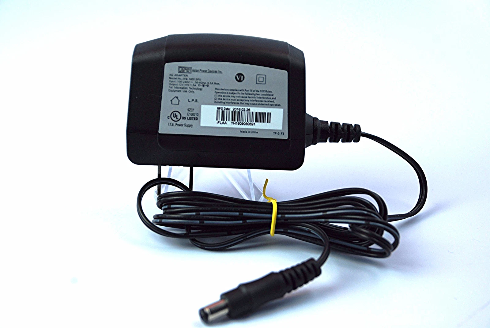 Asian Power Devices AC adapter, model WB-18D12FU. This adapter supports 100-240V 50-60Hz at 0.5A input and delivers a 12V 1.5A DC output, making it a reliable replacement for compatible devices. Please verify voltage, current, and connector compatibility before purchase.