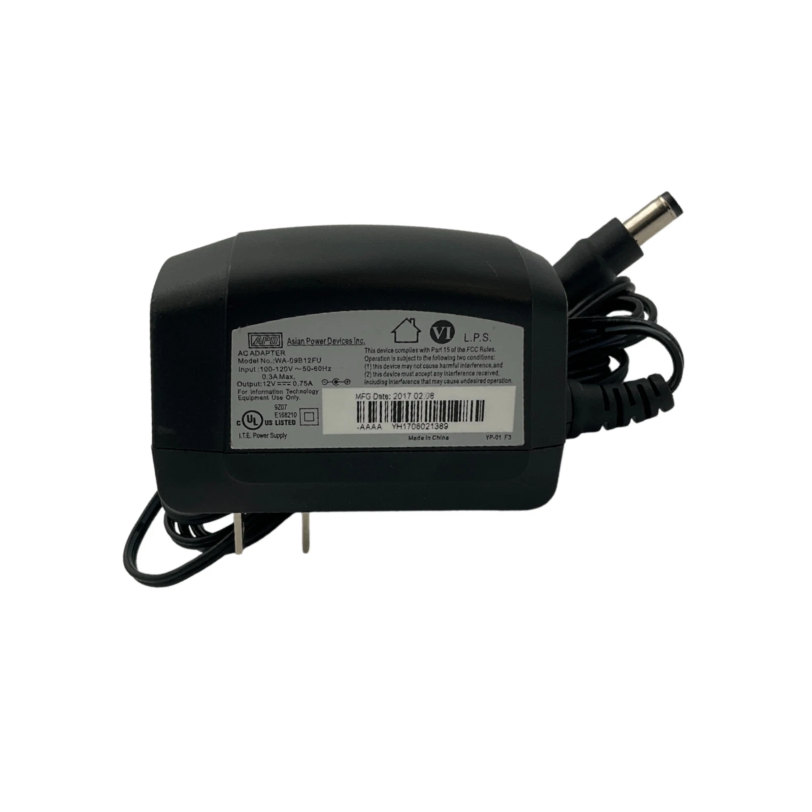 Asian Power Devices power adapter, model WA-09B12FU. This adapter supports 100–120V 50/60Hz at 0.3A input and provides a 12V 0.75A DC output. Compatible with various modems, routers, and extenders. Please verify plug size, voltage, and current compatibility before purchase.