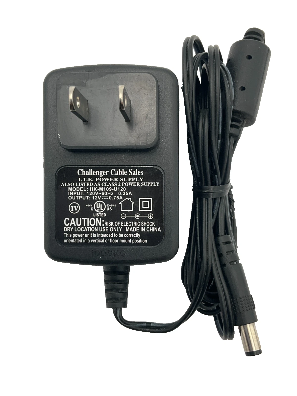 Challenger CS power adapter, model HK-M109-U120. This adapter supports 120V 60Hz at 0.3A input and delivers a 12V 0.75A DC output, making it a reliable replacement for compatible devices. Please verify voltage, current, and connector compatibility before purchase.