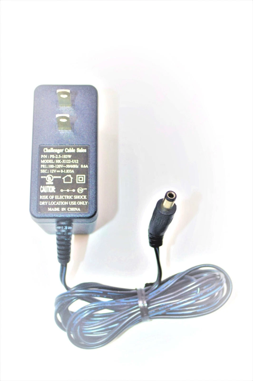 Challenger CS power adapter, model HK-X122-U12 (P/M: PS-2.5-183W). This adapter supports 100–120V 50/60Hz at 0.6A input and delivers a 12V 1.833A DC output.