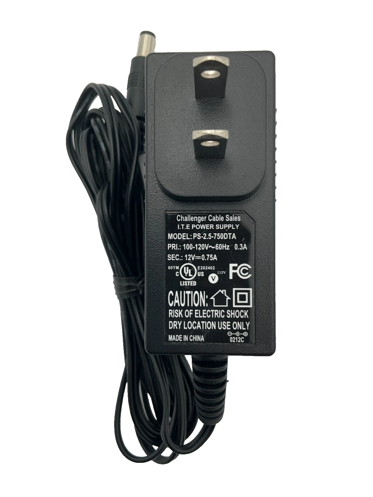 Challenger CS power adapter, model PS-2.5-750DTA. This adapter supports 100-120V 60Hz at 0.3A input and delivers a 12V 0.75A DC output, making it a reliable replacement for compatible devices. Please verify voltage, current, and connector compatibility before purchase.