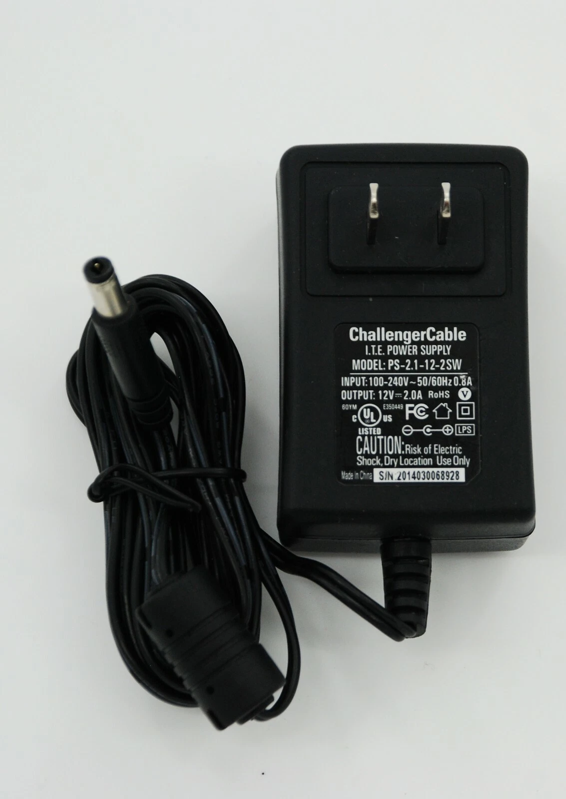 Challenger CS power supply, model PS-2.1-12-2SW. This adapter supports 100–240V 50/60Hz at 0.8A input and provides a 12V 2A DC output, making it a reliable replacement for compatible devices. Please verify voltage, current, and connector compatibility before purchase.
