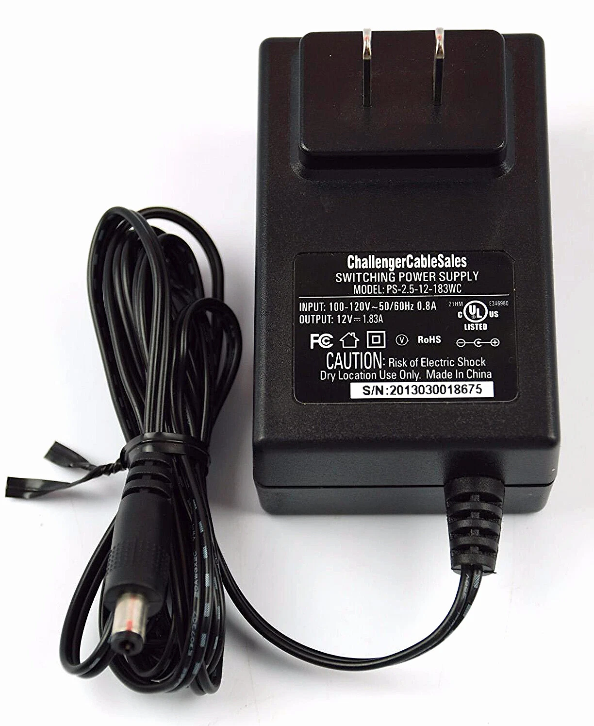 Challenger CS power adapter, model PS-2.5-12-183WC. This adapter supports 100–120V 50/60Hz at 0.8A input and provides a 12V 1.83A DC output, making it a reliable replacement for compatible devices. Please verify voltage, current, and connector compatibility before purchase.