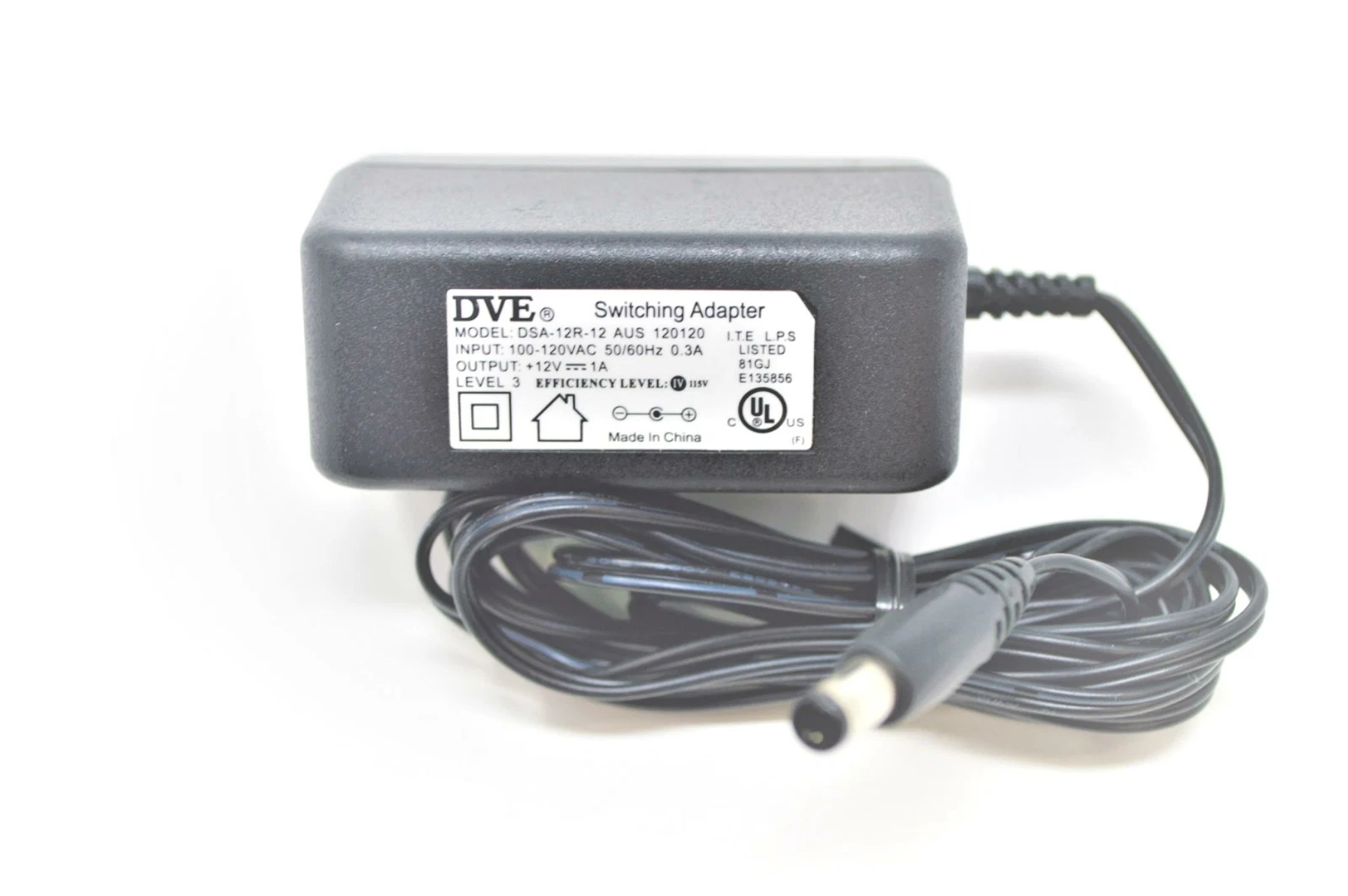 DVE power adapter, model DSA-12R-12 AUS. This adapter supports 100-120V AC 50/60Hz at 0.3A input and delivers a 12V 1A DC output, making it a reliable replacement for compatible devices. Please verify voltage, current, and connector compatibility before purchase.