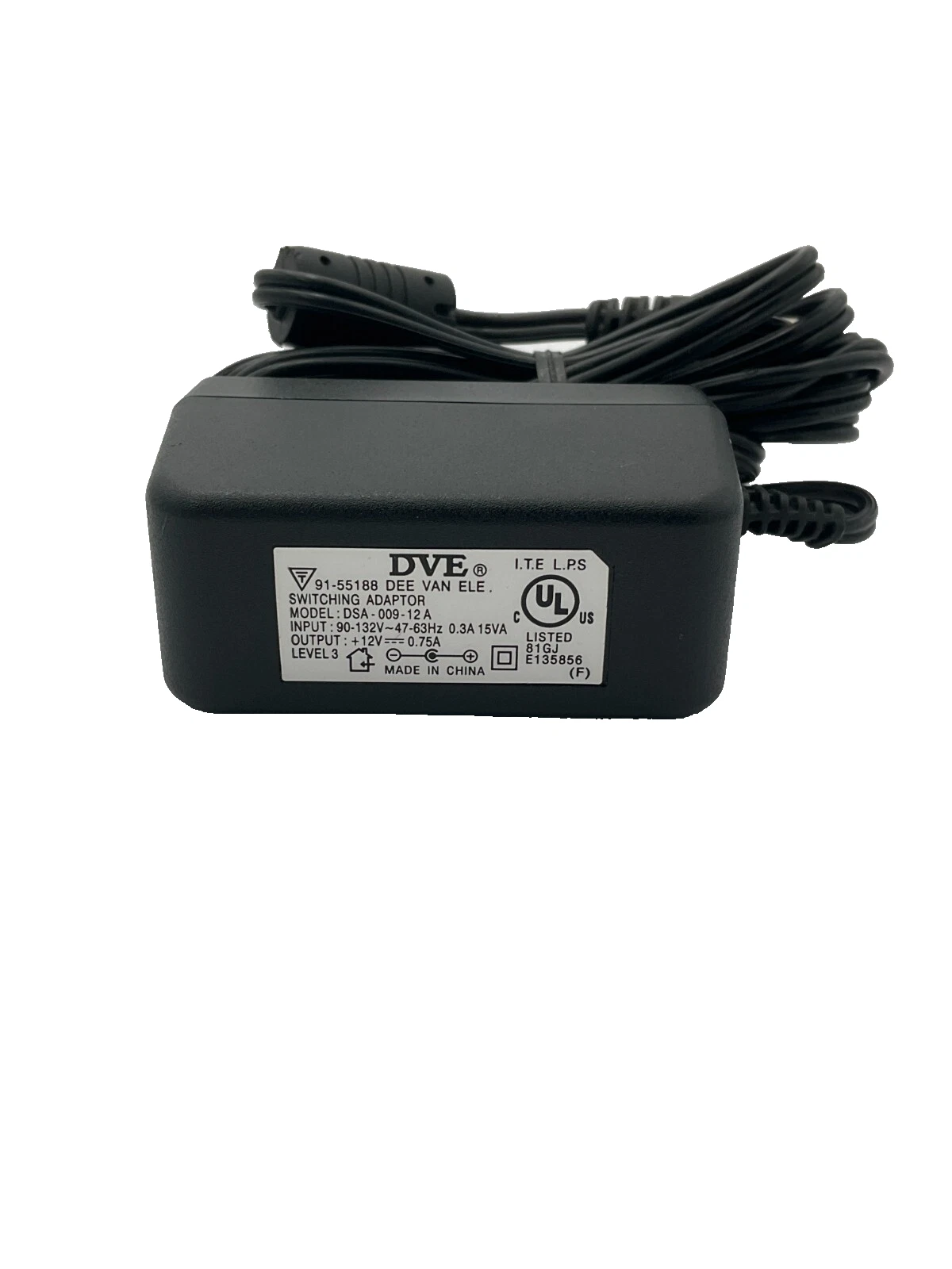 DVE power supply adapter, model DSA-009-12A. This adapter supports 90-132V 47/63Hz at 0.3A input and delivers a 12V 0.75A DC output, making it a suitable replacement for compatible devices. Please verify voltage, current, and connector compatibility before purchase.