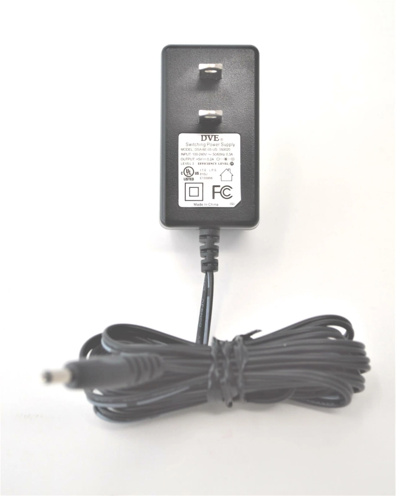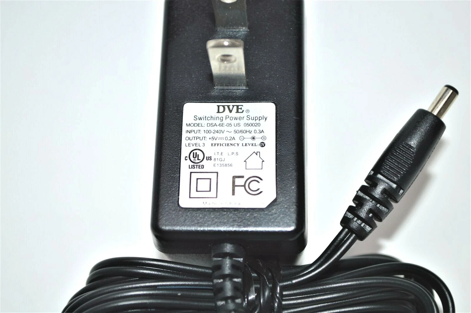 DVE power supply, model DSA-6E-05 US 050020. This adapter supports 120-240V 50/60Hz at 0.3A input and delivers a 5V 0.2A DC output, making it a reliable replacement for compatible devices. Please verify voltage, current, and connector compatibility before purchase.