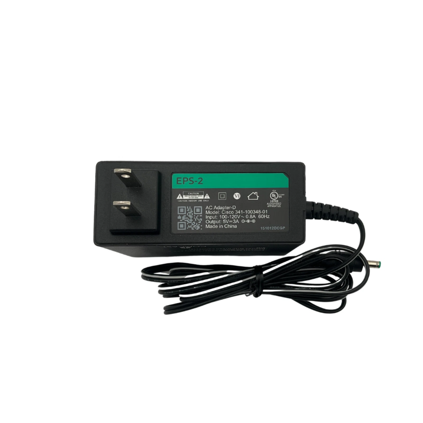 EPS-2 power adapter, model Cisco 341-1003488-01. This adapter supports 100–120V 60Hz at 0.8A input and delivers a 5V 3A DC output.