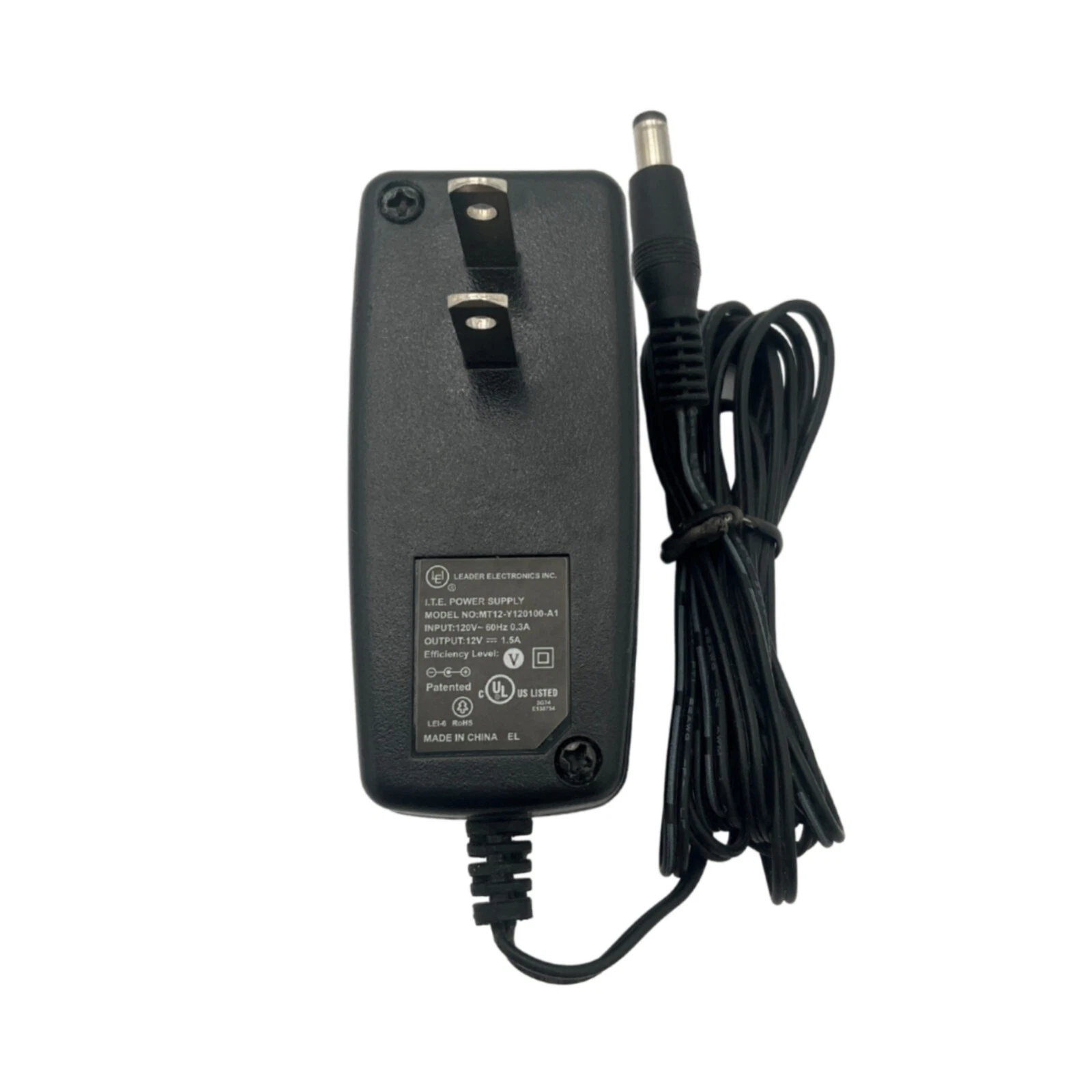 LEI power adapter, model MT12-Y120100-A1. This adapter supports 120V 60Hz at 0.3A input and provides a 12V 1.5A DC output, making it a reliable replacement for compatible devices. Please verify voltage, current, and connector compatibility before purchase.