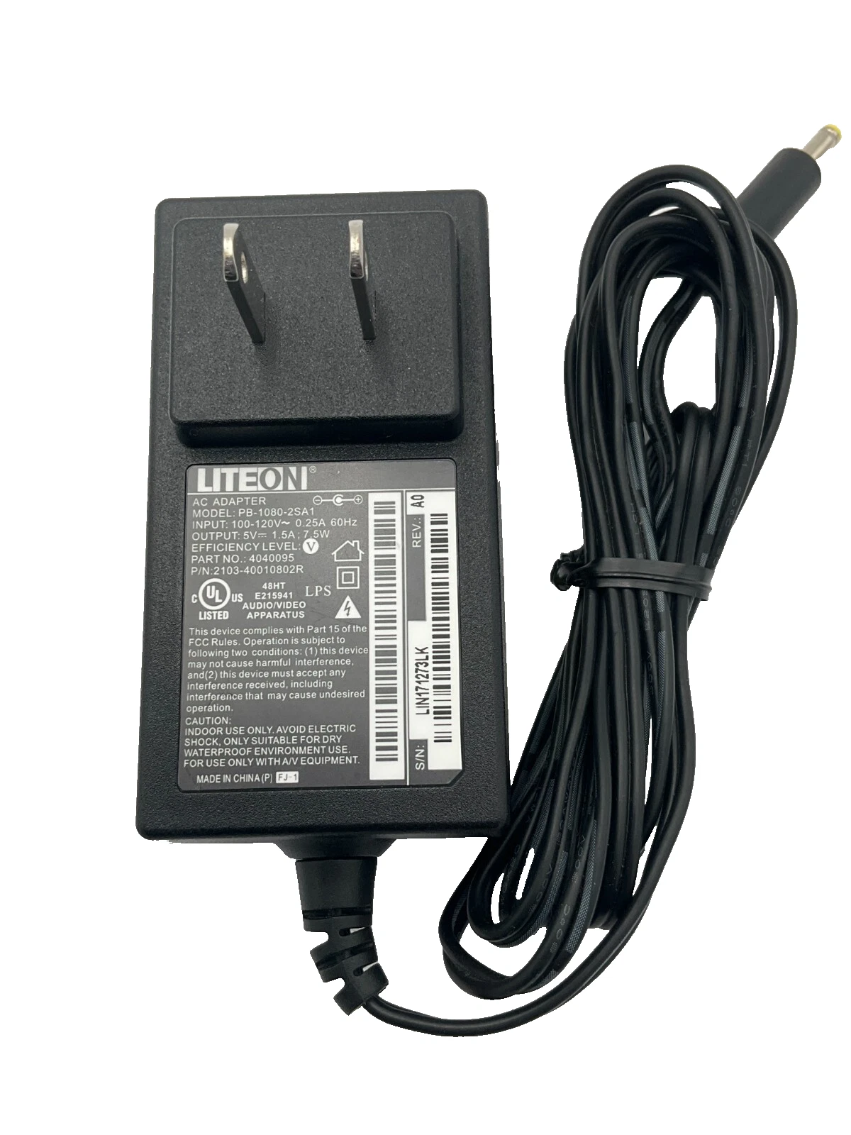 LiteOn AC power adapter, model PB-1080-2SA1 (P/N: 4040095). This adapter supports 100-120V 50-60Hz at 0.25A input and delivers a 5V 1.5A DC output, making it a reliable replacement for compatible devices. Please verify voltage, current, and connector compatibility before purchase.