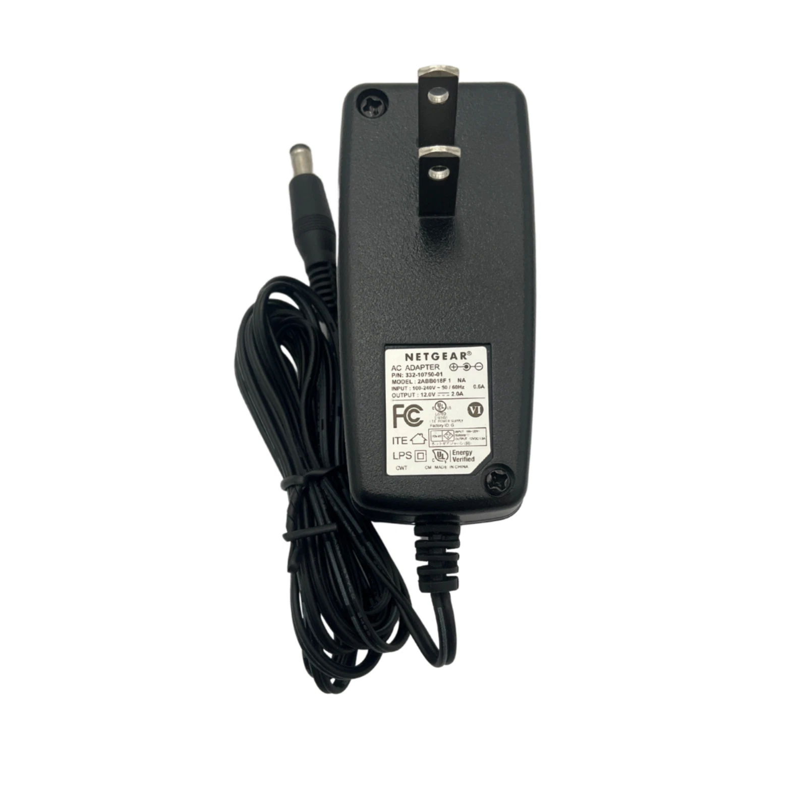 Netgear power adapter, model 2ABB018F NA (P/N: 332-10750-01). This adapter supports 100–240V 50/60Hz at 0.6A input and provides a 12V 2A DC output, making it a reliable replacement for compatible devices. Please verify voltage, current, and connector compatibility before purchase.