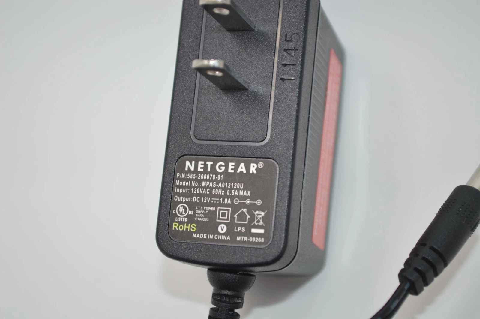 Netgear power adapter, model MPAS-A012120U (P/N: 585-200078-01). This adapter supports 120V 60Hz at 0.5A input and provides a 12V 1A DC output, making it a reliable replacement for compatible devices. Please verify voltage, current, and connector compatibility before purchase.