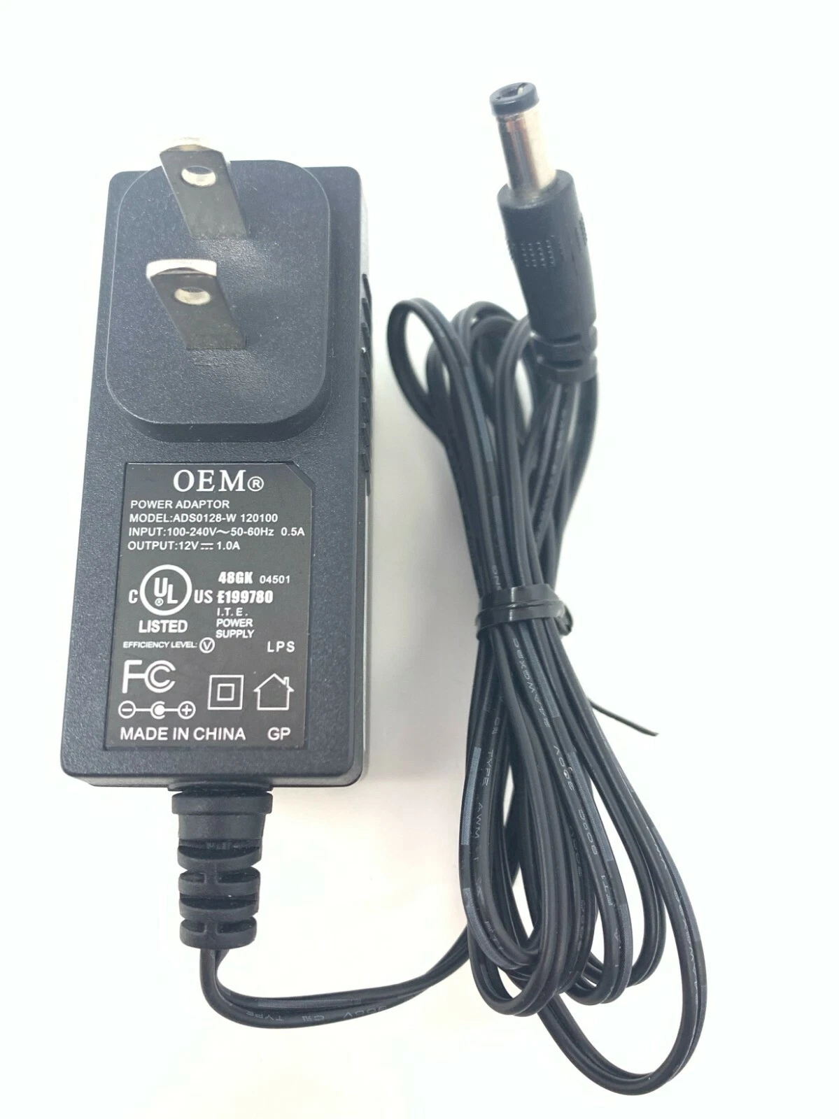 OEM power adapter, model ADS0128-W 120100. This adapter supports 100–240V 50/60Hz at 0.5A input and provides a 12V 1A DC output, making it a reliable replacement for compatible devices. Please verify voltage, current, and connector compatibility before purchase.