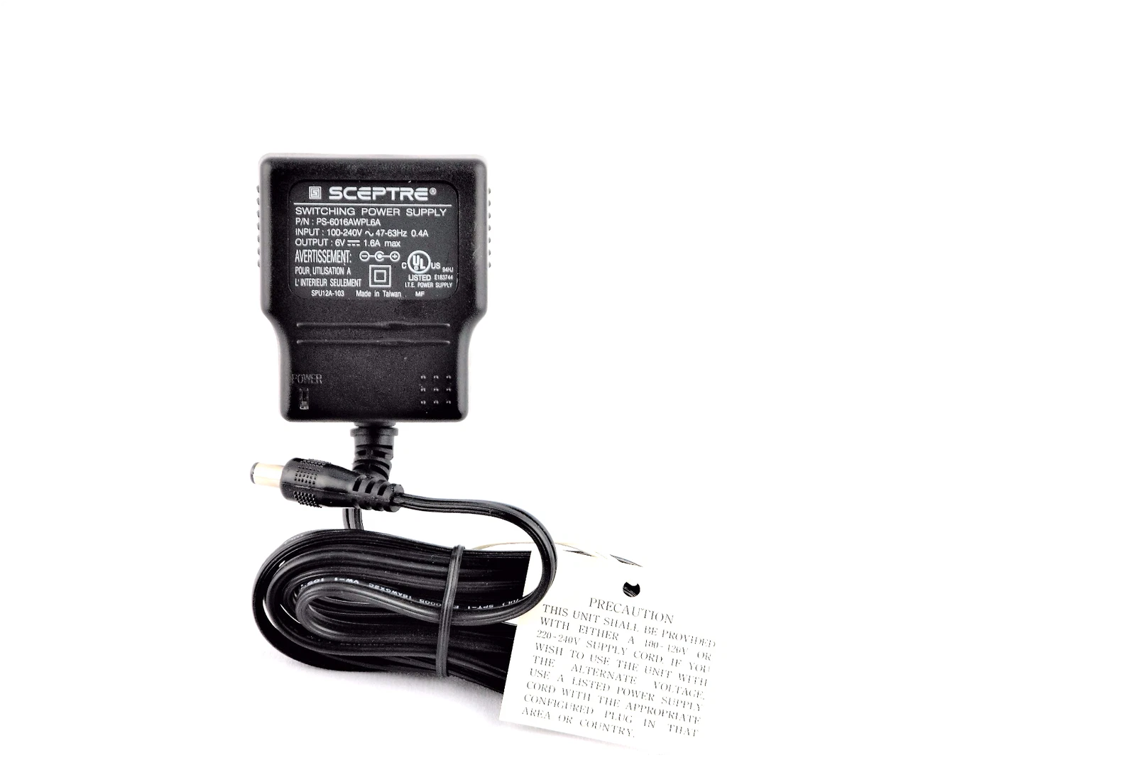 Spectre switching power supply, model PS-6016AWPL6A. This adapter supports an input of 100–240V 47/63Hz 0.4A and provides a 6V 1.6A DC output, making it a suitable replacement power supply for compatible electronic devices. Please verify your device’s voltage, current, and connector requirements before purchase.
