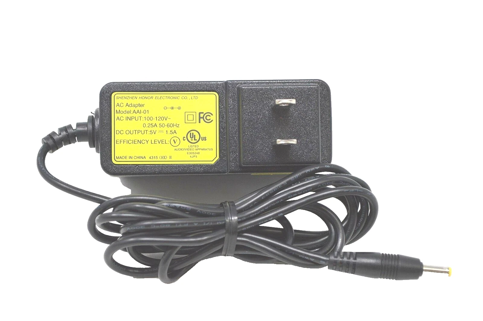 Shenzhen Honor Electronics AC power adapter, model AAI-01. This adapter supports 100–120V 50-60Hz at 0.25A input and delivers a 5V 1.5A DC output, making it a reliable replacement for compatible devices. Please verify voltage, current, and connector compatibility before purchase.