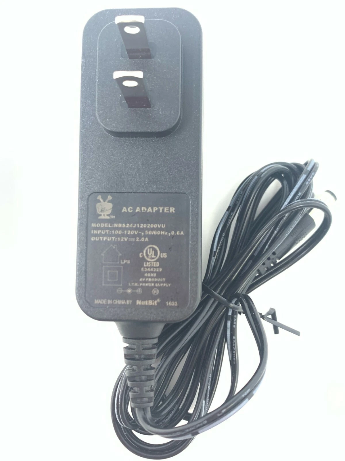 TiVo AC power adapter, model NBS24J120200VU. This adapter supports 100–120V 50/60Hz at 0.6A input and provides a 12V 2A DC output, making it a suitable replacement for compatible TiVo devices. Please verify voltage, current, and connector compatibility before purchase.