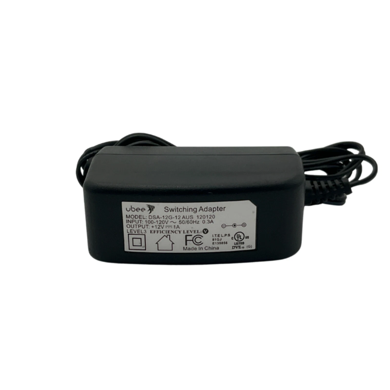 Ubee switching adapter power supply, model DSA-12G-12 AUS. This adapter supports 120V 50/60Hz at 0.3A input and delivers a 12V 1A DC output. Compatible with various modems, routers, and extenders. Please verify plug size and power requirements before purchase.