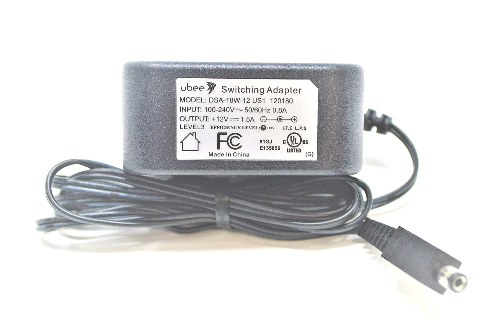 Ubee power adapter, model DSA-18W-12 USA-120180. This adapter supports 100–240V 50/60Hz at 0.8A input and delivers a 12V 1.5A DC output, making it a reliable replacement for compatible devices. Please verify voltage, current, and connector compatibility before purchase.