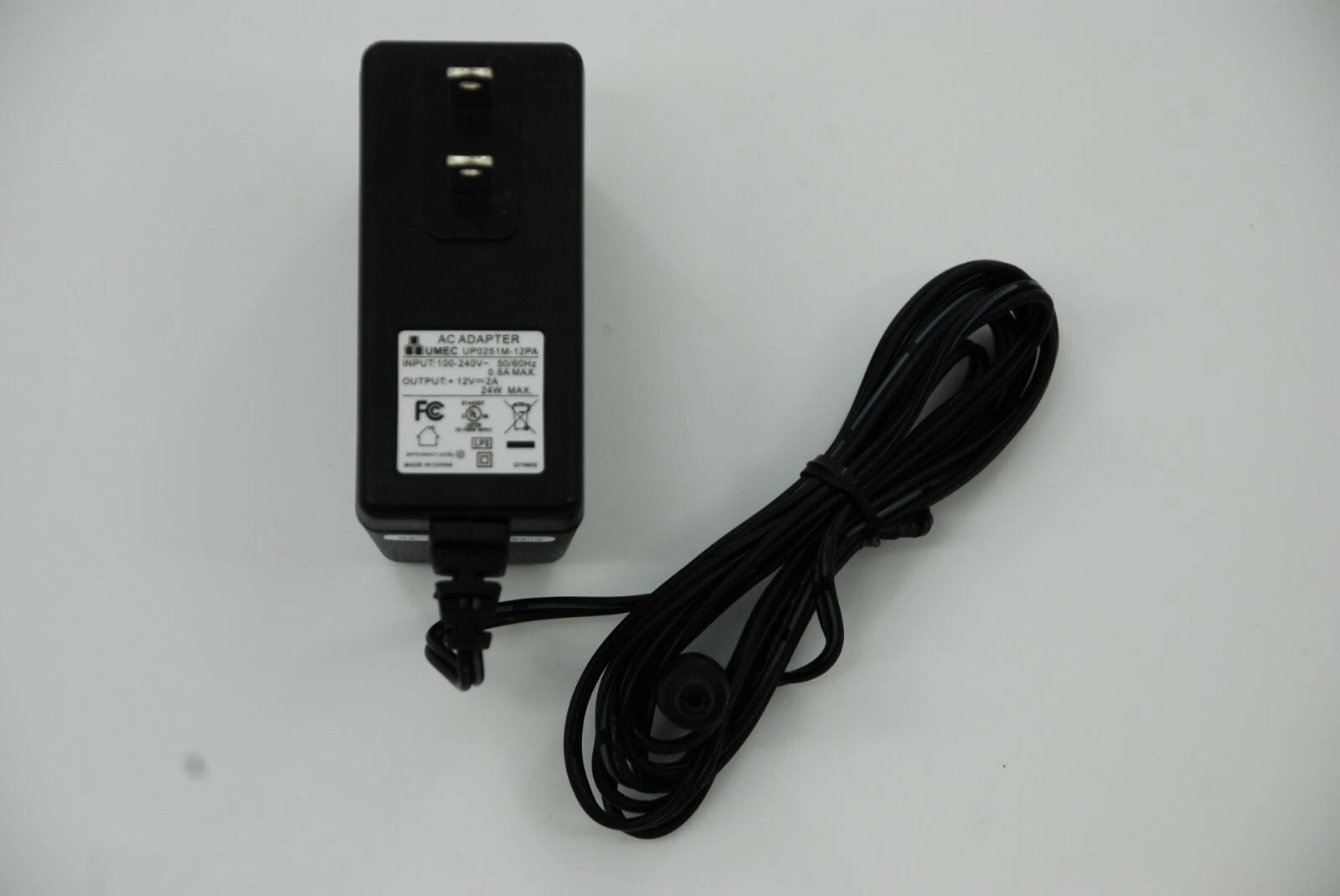 UMEC AC power adapter, model UP0251M-12PA. This adapter supports 100–240V 50/60Hz at 0.6A input and provides a 12V 2A DC output.