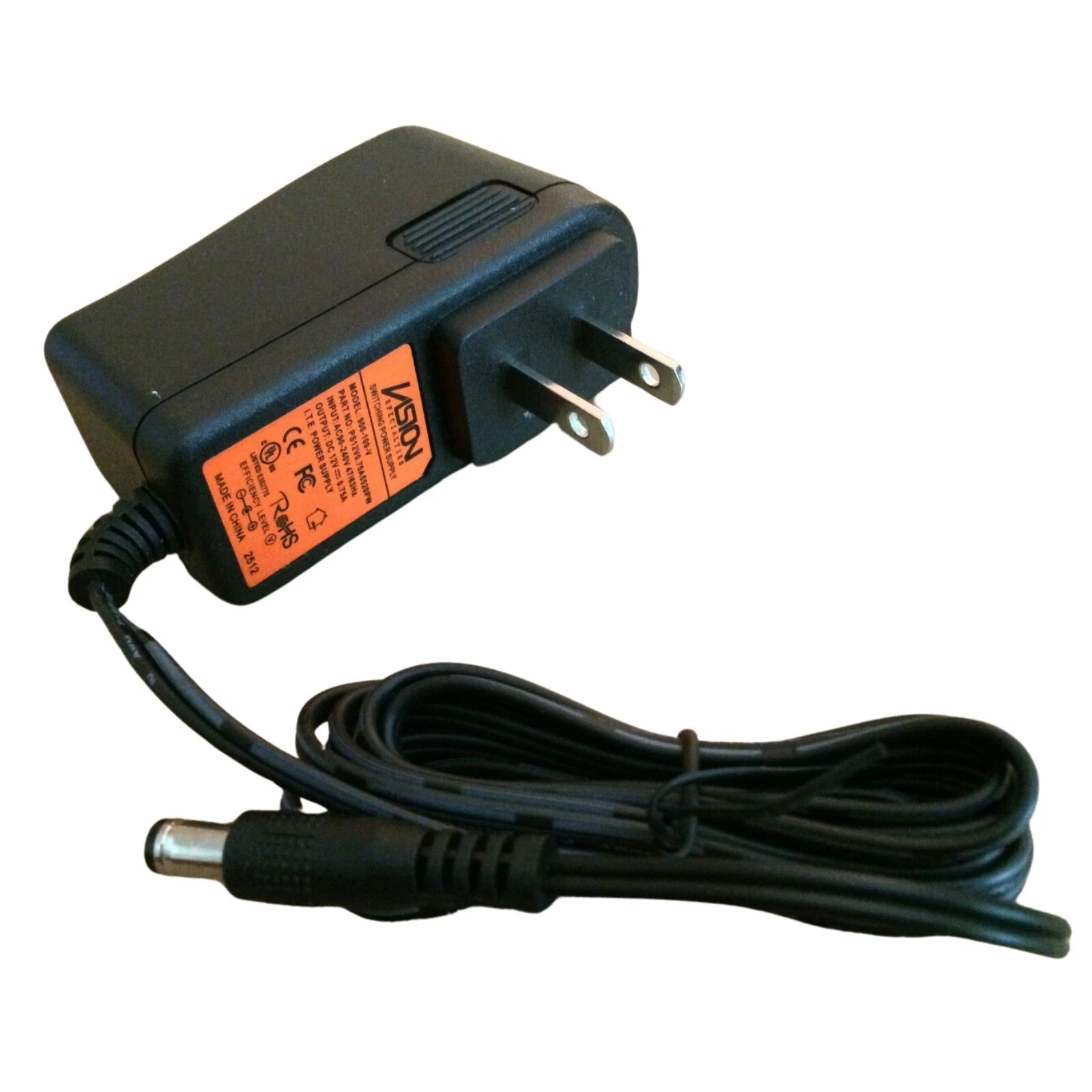 Vision AC switching power supply adapter, model 900-109-V (P/N: PS12V0.75A5520PW). This adapter supports 90-240V AC input and delivers 12V 0.75A DC output (Efficiency Level: V). For indoor, dry location use only. Do not cover with cloth or paper.
