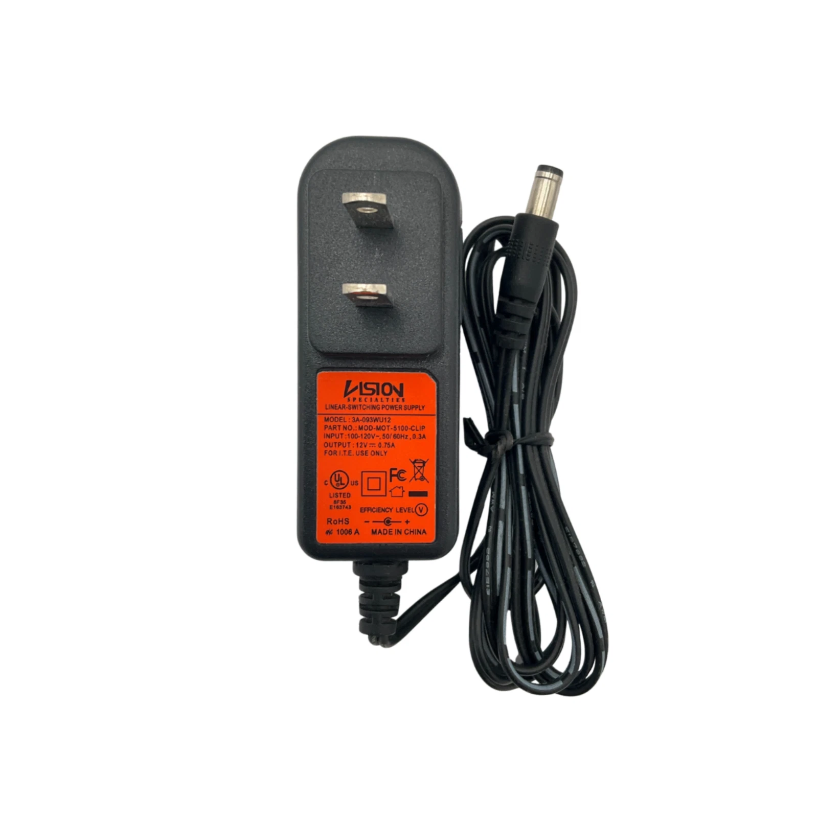 Vision power adapter, model 3A-093WU12 (P/N: MOD-MOT-5100-CLIP). This adapter supports 100-120V 50/60Hz at 0.3A input and delivers a 12V 0.75A DC output, making it a suitable replacement for compatible devices. Please confirm voltage, current, and connector compatibility before purchase.